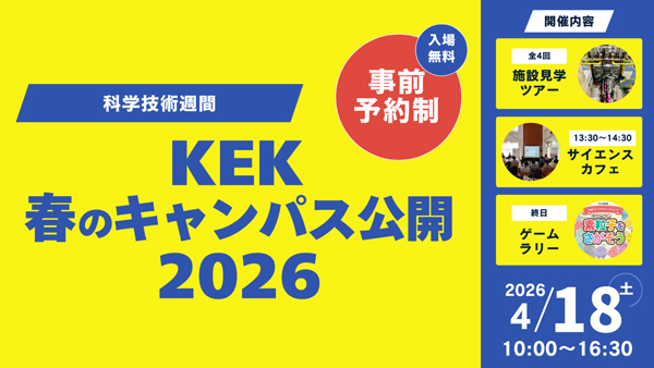 高エネルギー加速器研究機構(KEK)では、文部科学省が定める科学技術週間に合わせ4月18日(土)につくばキャンパスを公開します。研究施設の見学ツアーやサイエンスカフェなどを企画していますので、皆さまどうぞお越しください!